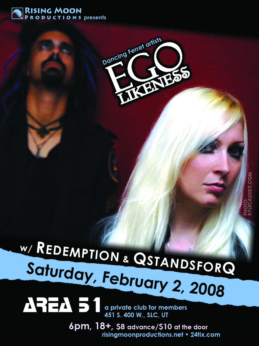 - Sat. Feb. 2, 2008 – Ego Likeness, Redemption, & QstandsforQ @ Area 51 [as Rising Moon Productions] [Flyer]