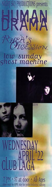 - Wed., April 22, 1998 – Human Drama, Rhea’s Obsession, & Low Sunday Ghost Machine @ Club Laga [Flyer]