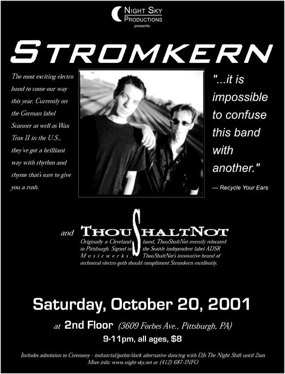 - Sat., Oct. 20, 2001 – Stromkern w/ ThouShaltNot @ 2nd Floor [The Upstage] [Flyer]